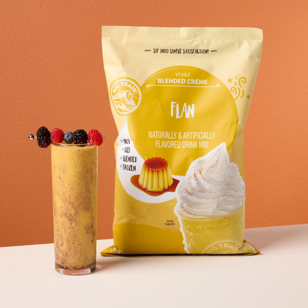 Step 1 In a blender, combine ice, flan mix, and water. Blend until smooth. Pour half of the frappe into a 16 oz glass.