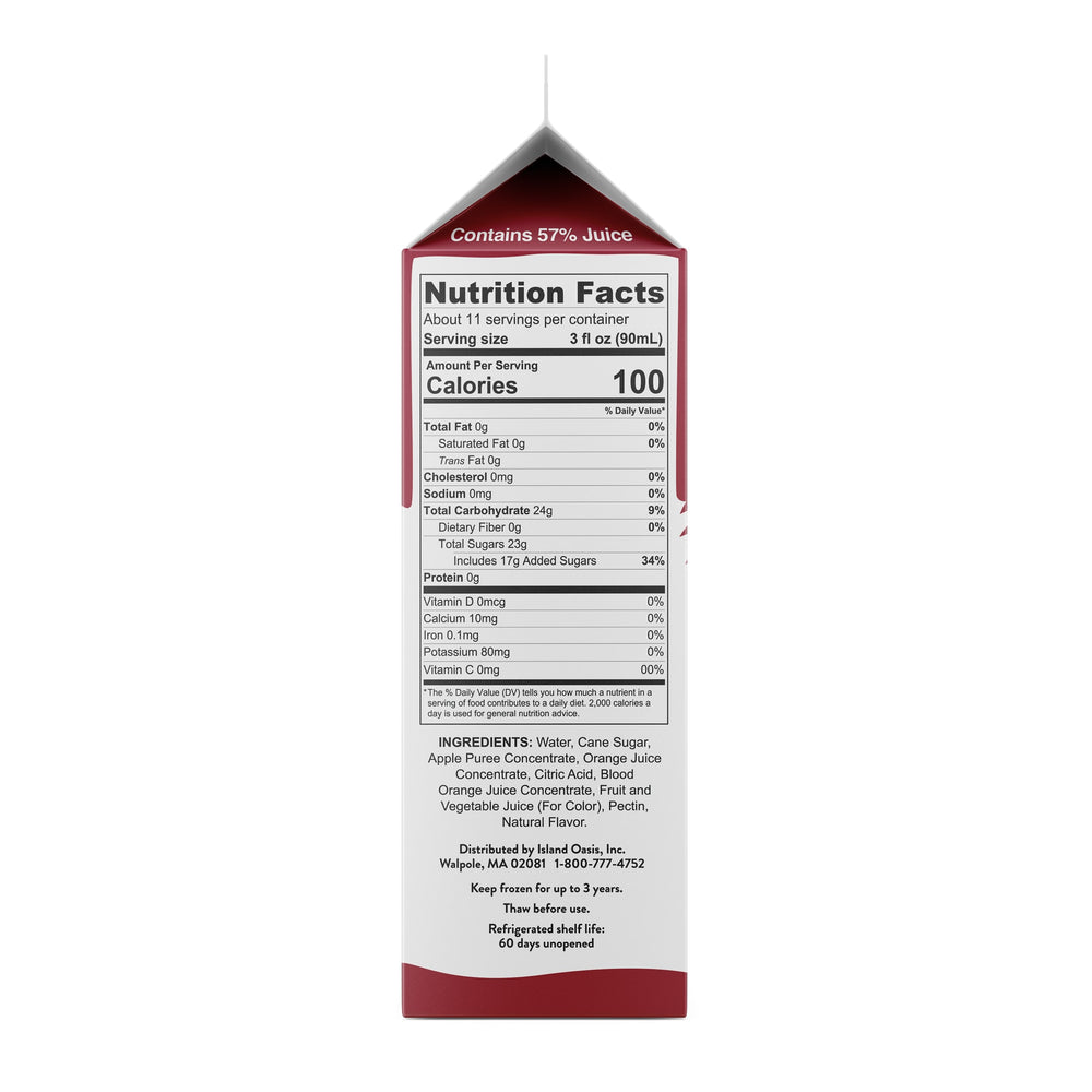 Island Oasis Blood Orange Beverage mix is a versatile and flavorful mix for flavored margaritas, lemonades, smoothies and more! Made with real fruit and premium ingredients. No artificial flavors or preservatives. No High Fructose Corn Syrup. Kosher certified.